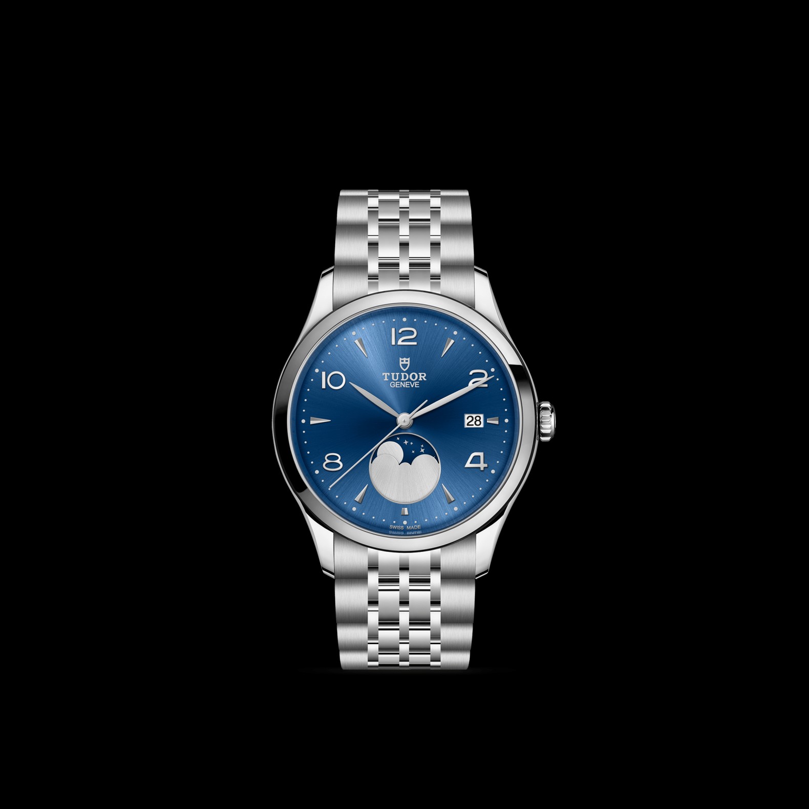 Blue satin sun-brushed dial with applied numerals and moon phase indicator